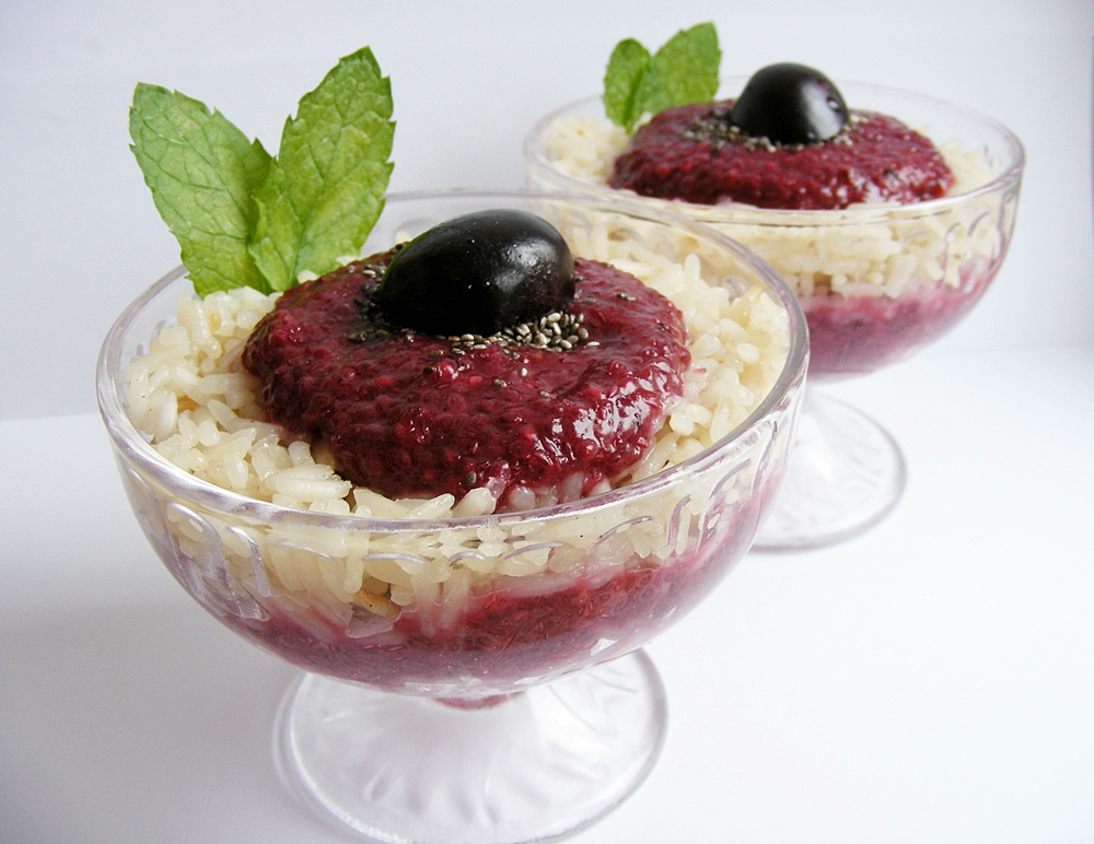 A jázmin rizst olíva olajon megfuttatjuk, majd másfélszer annyi növényi tejet adunk hozzá egy csipet (himalaya) sóval és vanília porral. Lefedve puhára főzzük. Majd ha kihűlt, kelyhekbe kanalazzuk rétegesen a már megzselésedett cseresznye öntettel. A tetejét cseresznyével és chia maggal, valamint menta levéllel díszíthetjük.